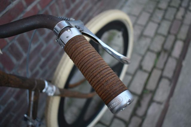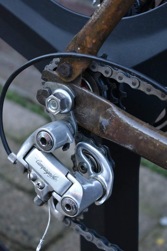Wil je iets aparts? Nou, volgens mij heb je dan iets gevonden. Een Gazelle frame uit 1962 is voorzien van een soort roestlak. Dit is echte roest met toevoeging van een vloeistof waardoor het roestproces gestopt wordt. Daarna zijn 6 lagen blanke lak erover gegaan om alles extra mooi uit te laten komen. De trispokes zijn van magnesium/aluminium legering. Crankstel is origineel, maar verchroomt. Derailleur van Campagnolo is iets over de top voor 3 versnellingen, maar ziet er wel supergaaf uit.